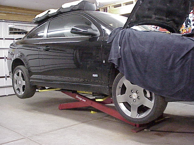 Cobalt in my garage on hoist to run Nitrous line under vehicle (Caution! do not run Nitrous supply line in passenger compartment). Back seat cushion removed to run Nitrous wiring loom from trunk to control area.