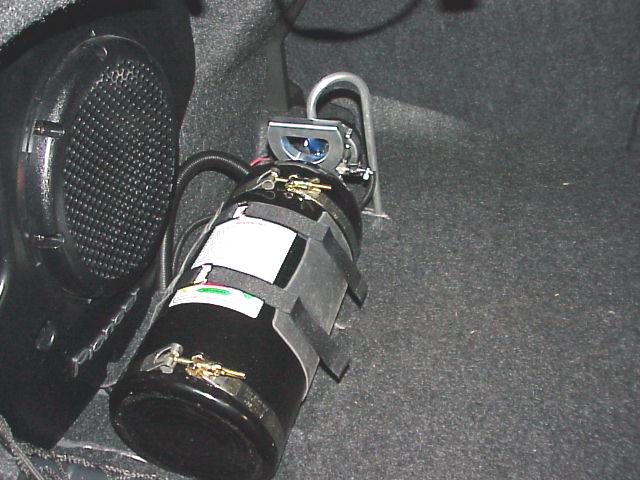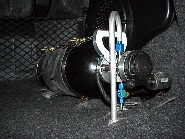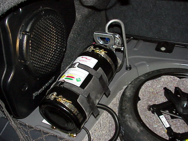 Completed Nitrous bottle install view. Blow down tube is necessary since Cobalt trunk is not sealed from passenger compartment.