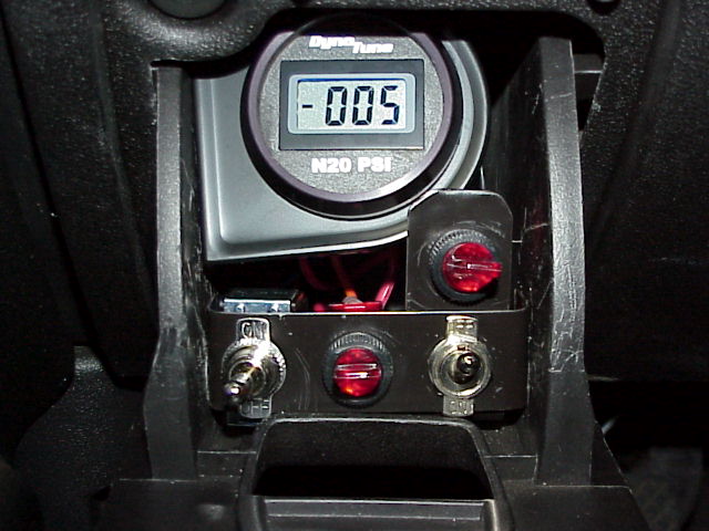 Nitrous controls in storage compartment to the left of steering column. Nitrous pressure gauge, switch identification lower L to R = Remote bottle opener, Bottle warmer, Stage 3 A/C clutch. Upper right switch is Nitrous arming switch. A/C switch is purposely mounted “upside down” so that all switches in the “up” position for maximum performance requested. Micro switch activated by throttle pedal at WOT is not shown. When this storage compartment is closed, there is no visible evidence of Nitrous controls.