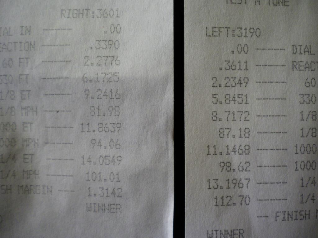 The temps were in the upper 80's most of the day. I made six runs that day, 3 in each lane. My best time was run #2 at 14.975 @ 98.38, so I have a ways to go. I did not use nls, I wanted to see what the car can do without it. I need to work on my launch & 60 ft times. I had lots of wheel hop on launch and tried to shift just above redline. I know that I'm most likely launching the car to hard - I tried to lower the RPM's on launch, but probably not enough with the adrenaline flowing and first time back at the track in years.