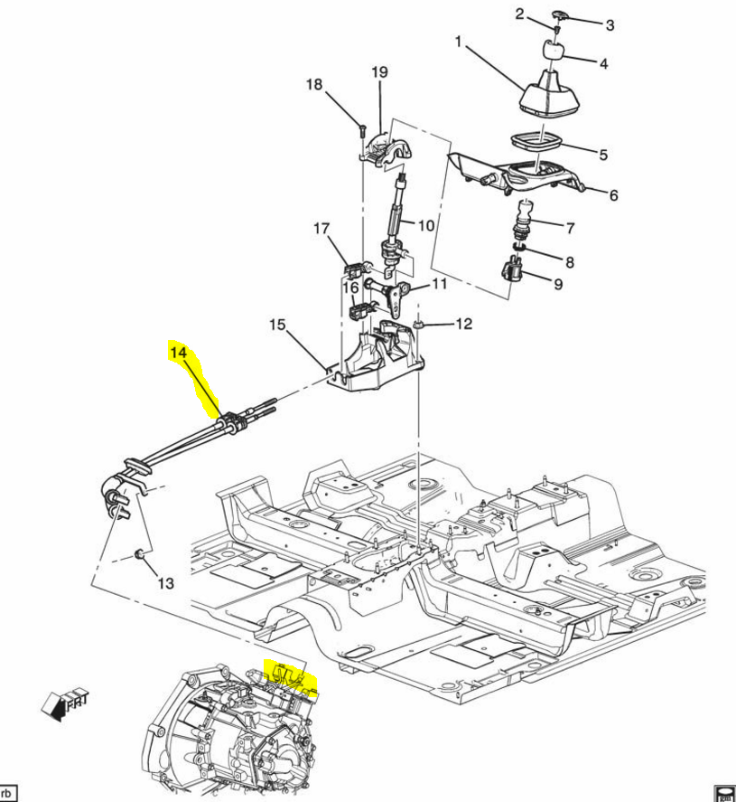 I do believe the exhaust heat shield is blocking your view of where the cables enter the car. I stand by my opinion on this. Replace them and get it over with. Take it for what it's worth. Bonus points: I would imagine your cables are full of gunky sludgy build up due to them being compromised which stiffens the whole feel up. I bet you once you install new ones you will think *WOW THIS SHIFTS AWESOME NOW!* I took all the interior panels off and the center console and they did the rest for $180. I would say it is well worth that. Issue Shifter is hard to move or sticks in cold weather. The shift control cables can malfunction, allowing debris and moisture to enter the shift control cables. See the figure below for the location of the shift control cable highlighted in yellow (14). https://cimg0.ibsrv.net/gimg/www.cob...7192b78255.jpg Resolution Replace the shift control cables. Service Instructions Required Tools: Metric 3/8 in Socket Set How to remove the center console: Step 1: Remove all the center console panels shown in the figure below. https://cimg2.ibsrv.net/gimg/www.cob...c551fa2f89.jpg Step 2: Remove all the screws shown in the figure below. https://cimg0.ibsrv.net/gimg/www.cob...114c2bd614.jpg Required Parts SHIFT CONTROL CABLE | Genuine GM | 25798498 NOTE: There are two cables but both come in part number 25798498. Also, if you order this part keep in mind that it is special order and will take 8+ days to arrive. Part Price: $90.09 Shipping: $33.00 Labor I removed the console on my own before taking it to GM: GM Labor: $180 My Labor: 1.5 hours Total Cost: $303.09 Total Time: 1.5 hours If you do not remove the console on your own and order the part from GM it will be more. GM Labor: $200+? GM Parts: $140+ Can someone sticky this common issue? How do you get the moderators to make something a sticky? |