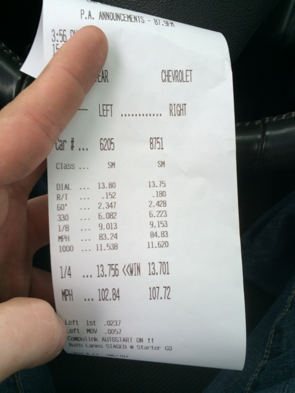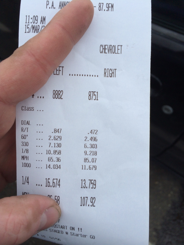 Took it to the track for street wars. My first time running on a track. Ever. Ran 13.75 first. Shitty second. 13.70 last. Here's a video of the last run: https://www.facebook.com/video.php?v=878113245584312