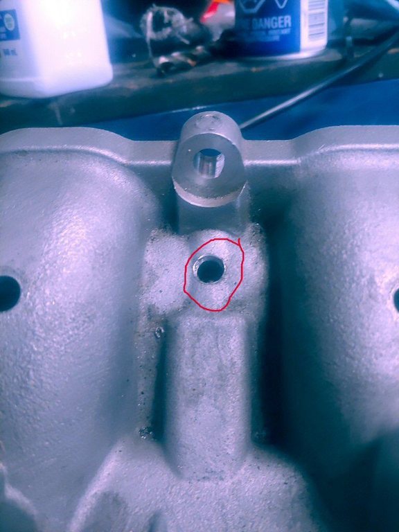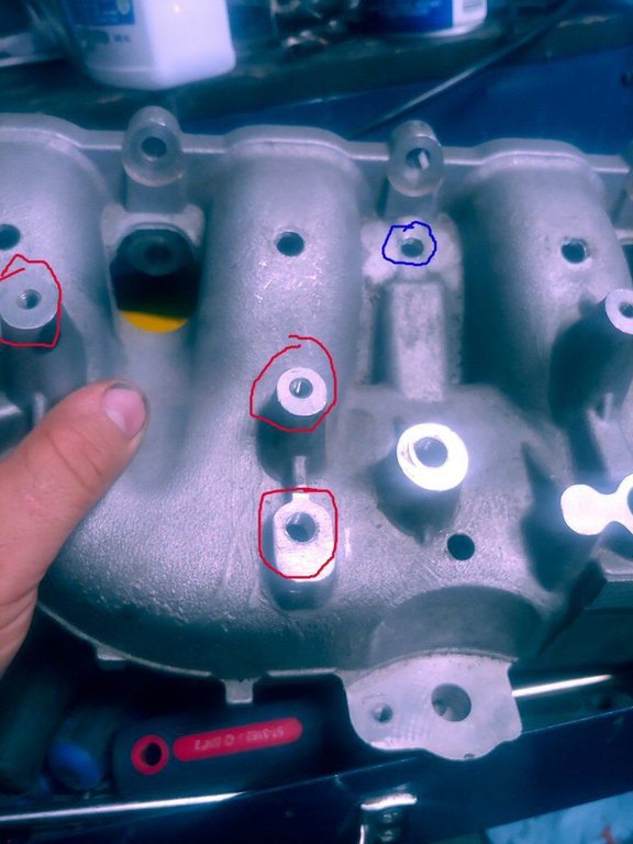 - next, notice the blue circle on the picture. that's where you want the next hole. right on that little ridge, about where I have that hole. this goes down into pcv port. its thin there so don't go drilling right through the manitold, just till you feel your through lol