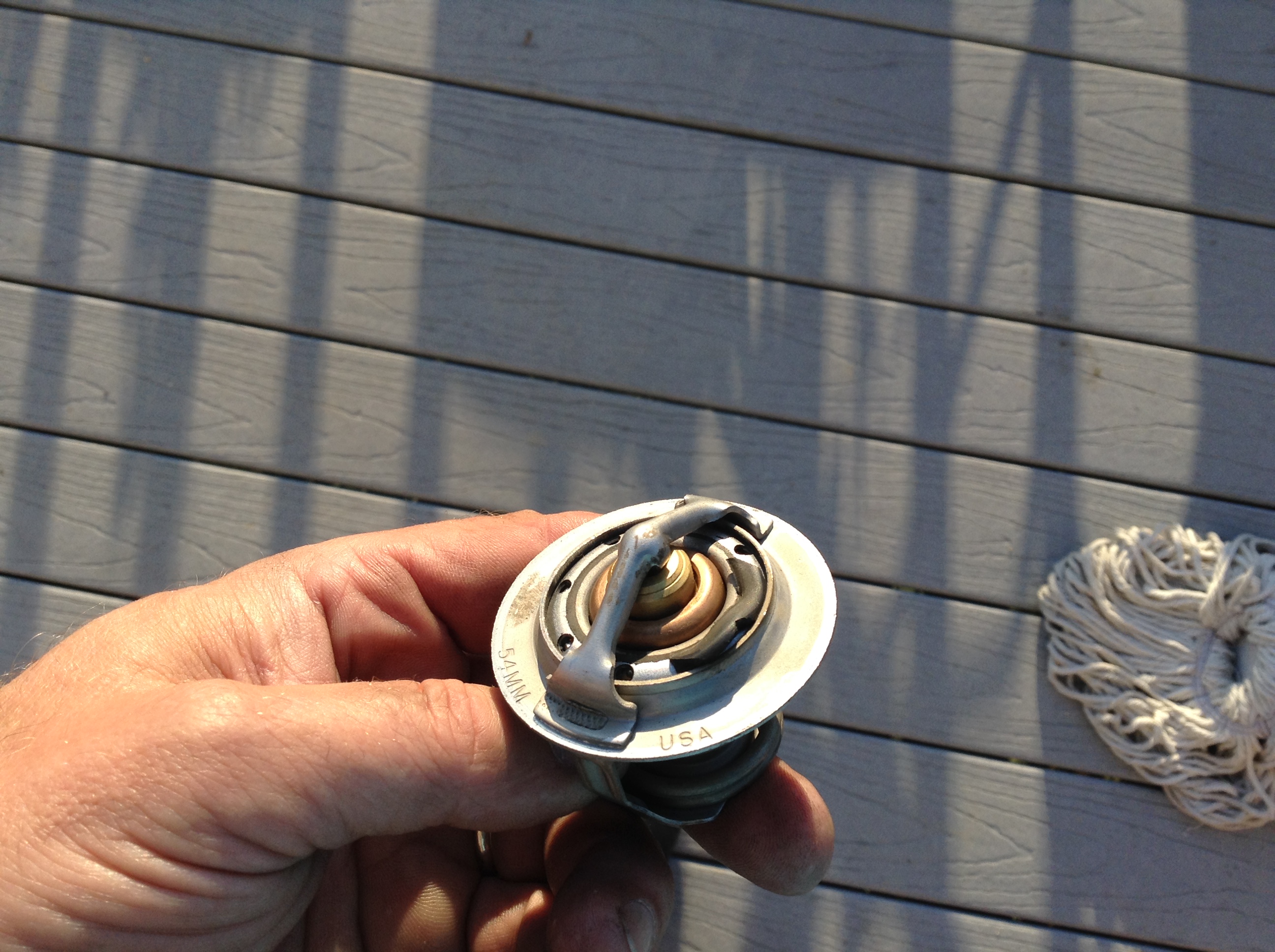. I read a previous post and the person said change the thermostat. I didn't understand why but finally said screw it, I'll change the t-stat and coolant. When I finally got the old t-stat out, this is what it looked like. I know this has been a subject that has been "done to death" but I hope this helps someone out. Looks like the inner rubber gasket on the t-stat has started to come apart or deformed and would never completely close. A/C has worked ever since. Battling a few other issues still, might make some new posts on them later.
