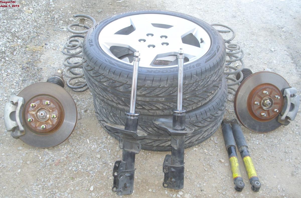 Both rear sides includes stock springs, sachs shocks, and rotors. This will give you almost everything else that you need to conver to a fully FE5 suspension,. The best part is that it also includes all four wheels 18 x7 with relatively new tires(3500 miles).Wheels appear to have been recently painted to cover scratches and it appears to have been done fairly well. Tires are 215/45r18