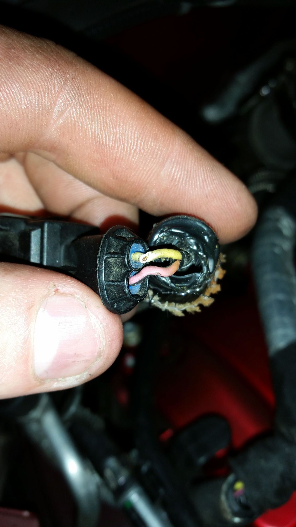 This is where the wire breaks. At first, you may not notice this break. I had to untwist the wires and slightly bend it before I found it was broke in half. The pink wire was nearly broken in half too. The insulation kept the wire in place such that it looked fine.